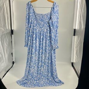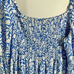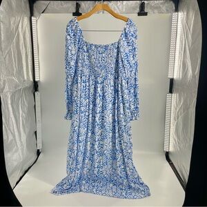 Tuckernuck SAIL TO SABLE STS Hydrangea Print Blue and White Maxi Milkmaid Cottage Dress Large. Very cottagecore garden preppy style. Smocked square neckline with a puff boho sleeve. Does have some faint wash wear fading.