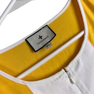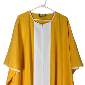 Tuckernuck Summers in St. Tropez Celeste Caftan in women’s size M/L. Breezy cotton/tencel blend with a relaxed oversized fit, vibrant yellow and white colorblock design, and effortless drape. Perfect for resort wear, vacations, or elevated everyday lounging.