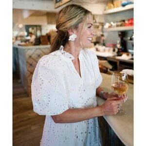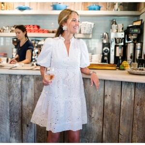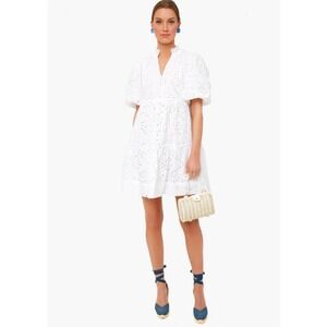 Chic white mini dress. Features eyelet design. Puff sleeves add elegance. Perfect for summer outings.