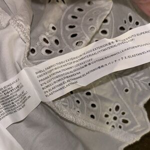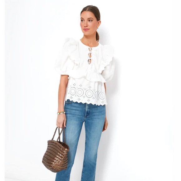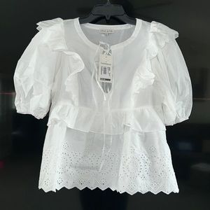 Elegant white blouse with ruffle details. Features eyelet design and puff sleeves. Perfect for casual or dressy occasions.