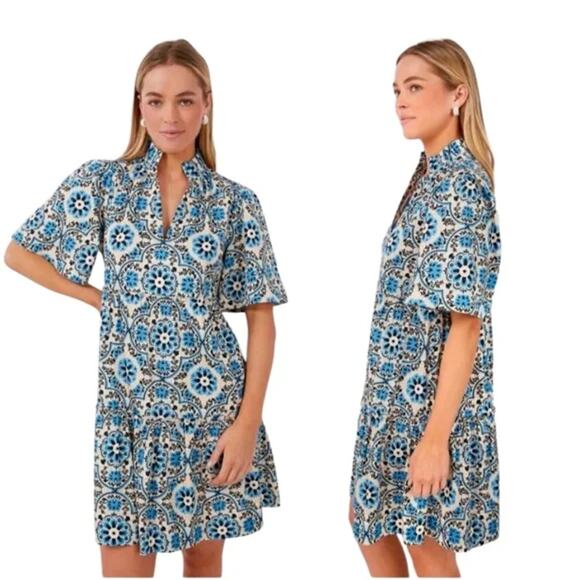 Tuckernuck X-SMALL Golden Medallion Crawford Dress Blue White Ruffle Mini