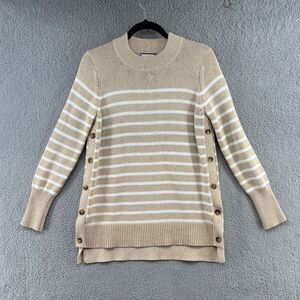 Tuckernuck Tan Stripe Bar Harbor Sweater in size XS. This timeless, preppy sweater is crafted from 100% cotton and features a classic tan and white horizontal stripe design. Functional side button detailing adds versatility, allowing you to style it open or closed, while the ribbed crew neckline, cuffs, and hem give a polished finish. Longer tunic length with side slits makes it perfect for layering with leggings, jeans, or shorts.