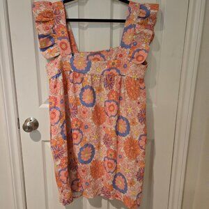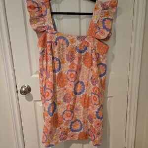 Tuckernuck x Cameran Eubanks Wimberly Folly Hazel Flutter Sleeve Dress. This is in a multicolored floral print and a size XL. Armpit to armpit measures 21 inches and shoulder to hem is 39 inches.
