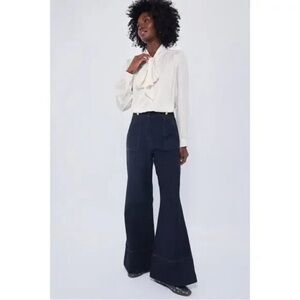 Elevate your denim collection with these brand new with tags wide-leg jeans from the India Hicks x Tuckernuck collaboration. The Palladian Pant features a structured high waist, gold-tone buttons, front patch pockets, and dramatic wide hems that bring a bold, retro-glam feel to any look.