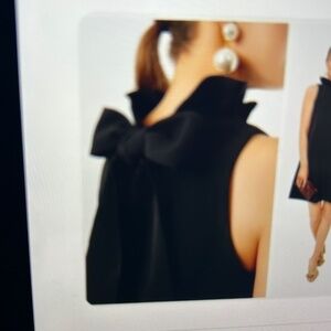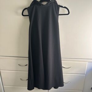 Reinforced 2" ruffle stand collar Sleeveless Bow tie back Swing shape Soft stretch crepe fabric Care: Machine wash cold, hang to dry