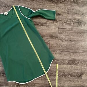 Clean lines, stretch crepe fabric and a shirttail hemline- the Green Seamed Shift Dress slips on in seconds but looks put-together. This dress takes your basic piece and pushes it to new levels with its lively green hue and crisp white piping for a bright and fun play on a staple shift style. We are packing this effortless frock for all of our future trips, as it is the perfect piece to dress up or down with a quick switch of accessories!