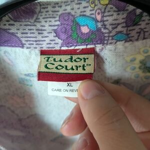 Elegant floral jacket by Tudor Court. Features vibrant purple and blue floral patterns.