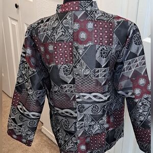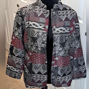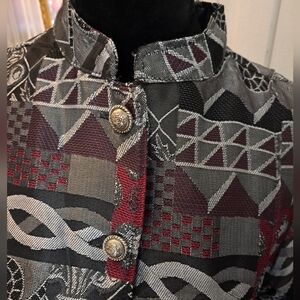 lightweight jacket with mandarin collar, ornate silver buttons, colors are gray, black & maroon, hidden front pockets, beautiful fabric & designs, it really looks like silk, pit to pit 21"