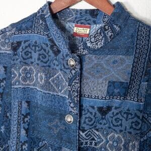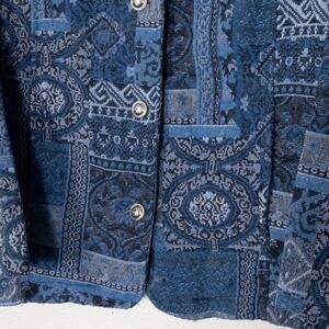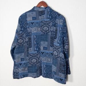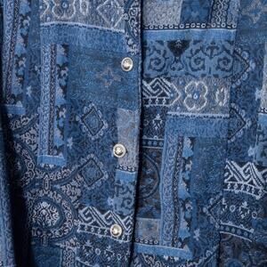 Tudor Court quilted denim patchwork jacket in a rich indigo bandana motif, designed with a folk-inspired cottagecore aesthetic. Women’s size large (estimated from the measurements. The jacket has a relaxed, boxy silhouette with lightweight quilt padding, making it a practical outer layer for everyday wear. A silver-tone button front and artisan patchwork construction give it that handcrafted, rustic charm, while the indigo wash channels a vintage 90s denim look.