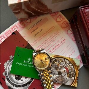 Elegant Tudor watch with a gold dial and silver bracelet. Features a date display.