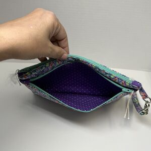 Gotta love this fun whimsical print with a hidden bear, a bumblebee and honeycomb. In beautiful colors that coordinate so well together. This great handmade wristlet style pouch has a detachable wristlet band and measures approximately 9 1/2 inches wide by 6 1/2 inches tall. There are two separate zippered pockets. Brand new and never used. Comes from a smoke free home.
