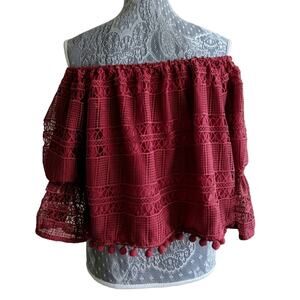 Tularosa Alexa Top Berry Off the Shoulder Crochet Bell Sleeve Pom Pom M New