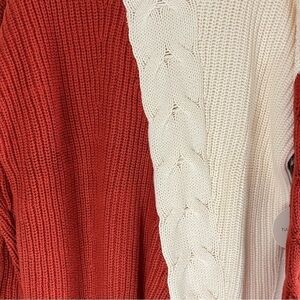 Brand new has never been worn tag is still attached no rips, tears or stains. Embrace the coming of colder seasons and don Tularosa's Austin Sweater. Red and white colorblocking and a cozy cable knit textile will have you in the mood for warm drinks by the fire. Cable knit fabric, ribbed knit trim, crew neck and front slit.