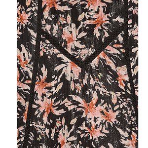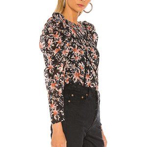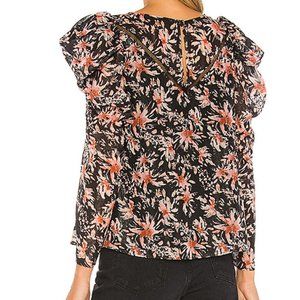Elegant floral blouse with puffed sleeves. Features a black base with pink floral pattern. Perfect for a chic look.