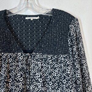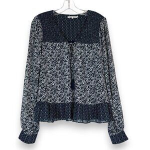 Top Blue White Floral Peasant Flowy Blouse Medium V-Neck. Smocked. Lined.Tie at front neck with tassels.