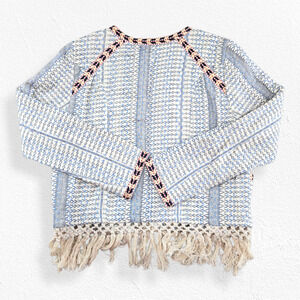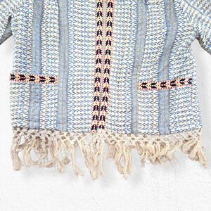 Tularosa Blue White Woven Embroidered Boho Fringe Jacket Open Blazer Size Medium