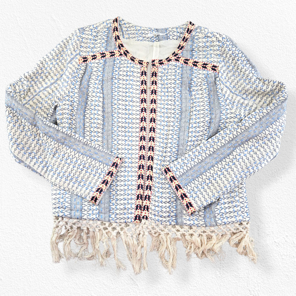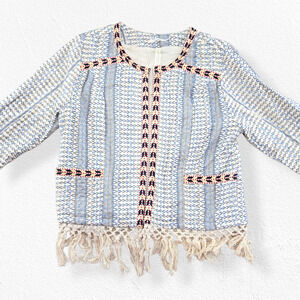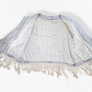 Tularosa Blue White Woven Embroidered Boho Fringe Jacket Open Blazer Size Medium