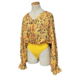 Tularosa Bodysuit Women's X Small XS Yellow Floral Long Sleeve Metallic