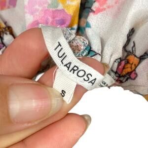 This dress by Tularosa is so adorable! It is a pull on style with smocked detail around the neck and waist. Dress can be worn on or off shoulder as shown. Sleeves are a puff style with ties inside the top and near cuffs to adjust. Dress is a short mini style. Minimal wear, dress is in excellent condition!