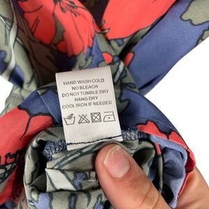 Make a bold statement in this eye-catching Tularosa romper, featuring a vibrant poppy floral print in red, green, and blue. This flattering piece combines a deep wrap neckline with long sleeves and a belted waist for a feminine silhouette. Ruffle trim at the cuffs and hem adds a playful touch, while the elastic waistband ensures comfort and fit.