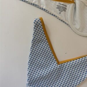 Chic bikini with blue and white gingham. Mustard trim adds a stylish touch.