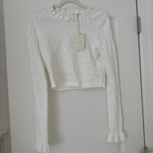 Top: Lana Sweater ($168 orig price) size M: 72% rayon, 28% nylon, Pointelle knit fabric with ruffled trim https://www.revolve.com/tularosa-lana-sweater-in-ivory/dp/TULA-WK485/?d=F§ionURL=undefined&size=M&code=TULA-WK485