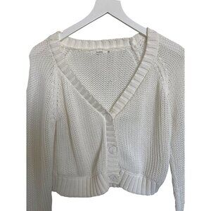 This Tularosa Margot cardigan in a pristine white shade is a stylish addition that effortlessly elevates your wardrobe. With its open knit design and ribbed detailing, it offers a chic blend of comfort and elegance. The front button closure allows for versatile styling, making it an ideal choice for all-day wear.