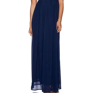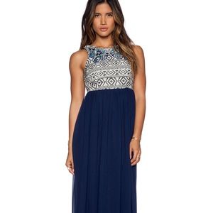 Tularosa Montera Dress as sold on Revolve. Beautiful beaded top on an embroidered background. Flowy navy skirt, fully lined. Shell: 79% poly, 21% cotton.Contrast: 100% cotton. Hand wash cold. Hidden back zipper closure. Front beaded embellishment. Wedding/prom/parties. New with tags. Armpit to Armpit 16", Shoulder to Hem 58" Section 63
