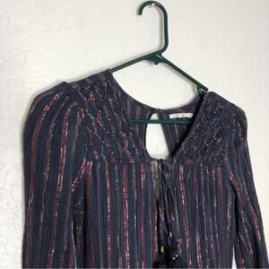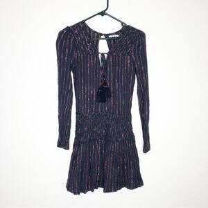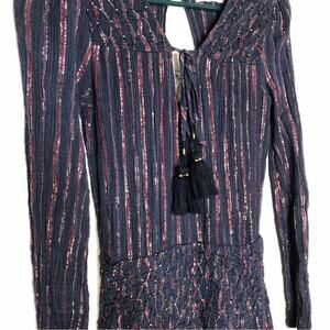 Tularosa Nina dark blue maroon metallic gauze smocked dress. Tassels that tie at front neckline. Smocked quilted beaded material at shoulders and hips. Crinkle gauze material. Open back with button at back neckline and back zipper. Size Extra Small XS. Excellent preowned condition.