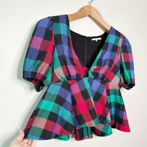 Black red blue green plaid cropped plunge puff sleeve cute top