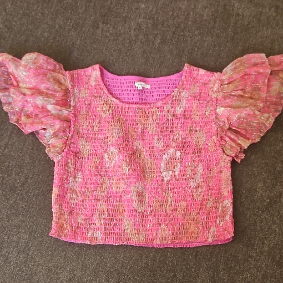This charming pink top features playful ruffled sleeves, perfect for adding a touch of fun to any outfit.