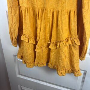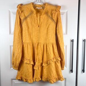Gorgeous Tularosa mustard yellow mini dress crafted from 100% cotton with intricate textured embroidery and delicate lace inset details. Features ruffled trim, a tiered skirt, and long puff sleeves with elastic cuffs for a soft, feminine silhouette.