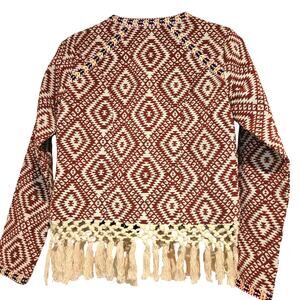Excellent condition with minimal to no signs of wear. This is the Santa Fe Fringe Jacket in Burnt Red (almost a burnt orange) with contrasting trim, fully lined. Cotton blend with a substantial woven jacquard feel. Open front with fringed hem and front pockets. Size XS, measures approx. 17.5" armpit to armpit, 18" at center back, plus 5" fringe.