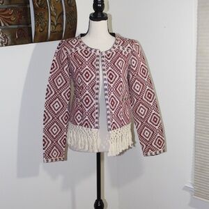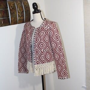 Tularosa Santa Fe Cream, Red, Blue Jacquard Fringe Tassel Hem Boho Jacket