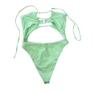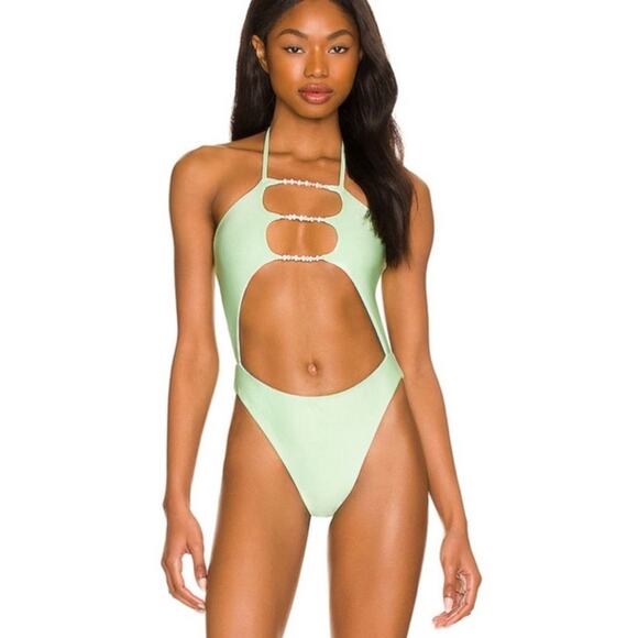 Stylish green melon swimwear by Tularosa. Features unique cut-out design. Perfect for beach days and pool parties.