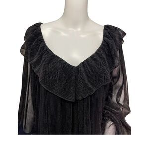 New with tags. Black tunic with sheet black metallic overlay. Ruffled collar and peasant sleeve. Great for an elevated day look or sexy evening look. Offers welcome. Ships fast.