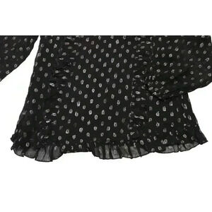 Add some bohemian flair to your wardrobe with this stunning Tularosa blouse. Featuring a polka dot pattern, long cold shoulder sleeves, and a crew neckline, this blouse is perfect for any occasion, whether you're traveling, heading to a party, or just running errands. The button closure and ruffle hem add a touch of femininity, while the metallic embroidery gives it a unique city vibe. Made from a blend of polyester and viscose, this chiffon fabric blouse is sheer and lined, ensuring a comfortable fit. This blouse is available in size XXS and is perfect for the summer, fall, or spring seasons.