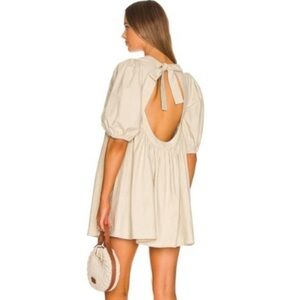 Tularosa Sydney mini dress in a soft sandstone hue, featuring voluminous puff sleeves, a flattering V-neckline, a flirty open back with bow tie detail, and a flowy A-line babydoll silhouette for an effortlessly feminine look.