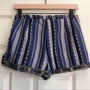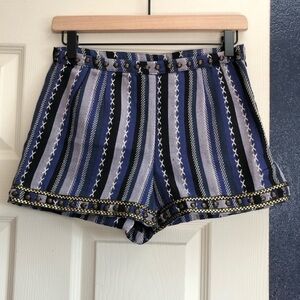 Blue and black striped shorts with studs around the waist and leg openings. It has a hidden zipper on the side for easy pull on. In excellent condition.