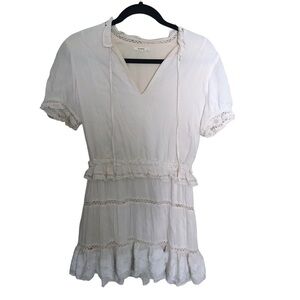 This cream ruffle mini dress from Tularosa sold at Revolve in the style Colleen is perfect for the spring and summer months. Features ruffle details, short sleeves, front tie, peplum hem, and v-neck neckline. A split ruffled neckline with drawstring tassel detail is amplified by an elasticized ruffled waist and tiered skirt.