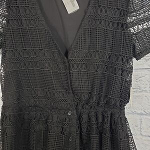New with tags, size small black dress by Tularosa. V-neck, button up style, with double layer boho style knit overlay. Short sleeve. Stretchy elasticized waist.
