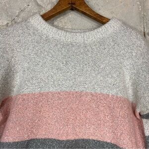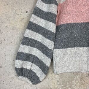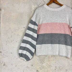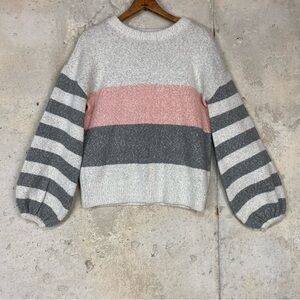 Tularosa “penny” light grey, dark grey and light pink striped crew neck knit sweater with balloon statement sleeves. Soft and cozy material