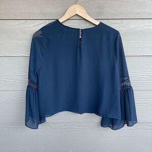 Embroidered lace trimmed woven top. 3/4 bell sleeves. Back keyhole with button closure. Partially lined.