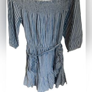 Tularosa Maida Ruffle Dress in Blue & White Stripe Medium Faux Wrap.