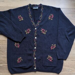 Tulchan Embroidered Floral Knit Cardigan Sweater - 100% Cotton - Navy Blue - XL