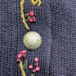 Tulchan embroidered floral knit cardigan sweater. 100% cotton. Features a navy blue knit background with embroidered greenery and pink / wine flowers. Deep v neckline and engraved silver metal buttons.