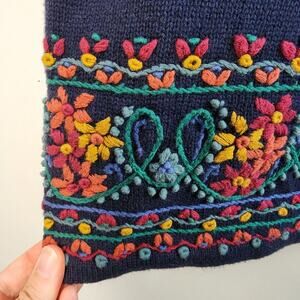 - Description: Dark blue knit long sleeve oversized sweater with knit embroidered floral detail throughout and at hemline; rounded neckline