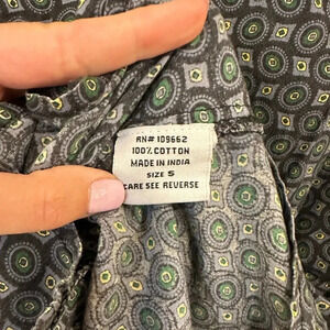 Women’s tulip clothing tunic + size small + 100% cotton + navy blue & green pattern + pockets & back pleats as shown + no flaws / good, used condition + ships from smoke free home + approx measurement, length 32in