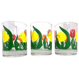 Tulip Floral 16 oz Double Old Fashioned 3 Glasses MCM Orange Red Yellow Lowball