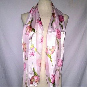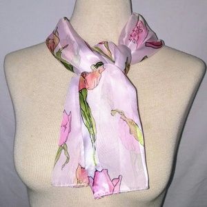 Beautiful Silky Spring Flowers Scarf in Shades of Pink with Sheer Stripes.